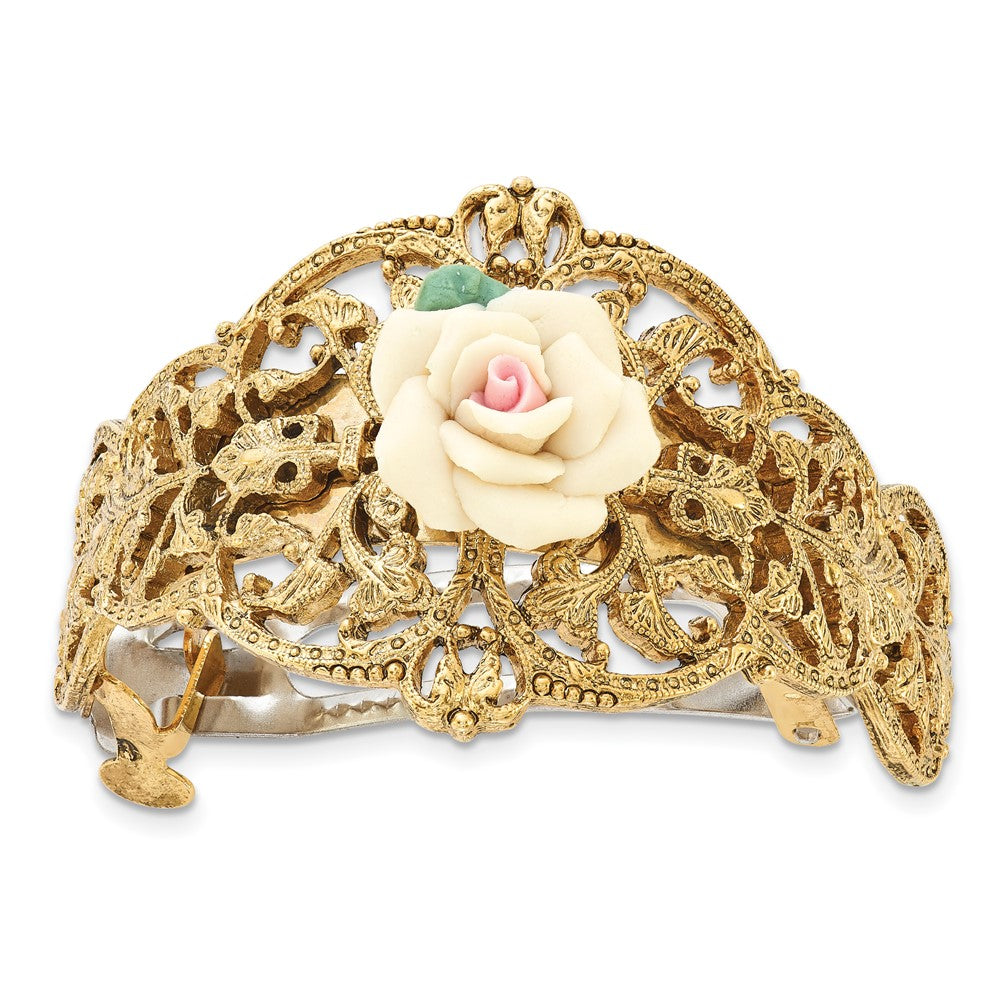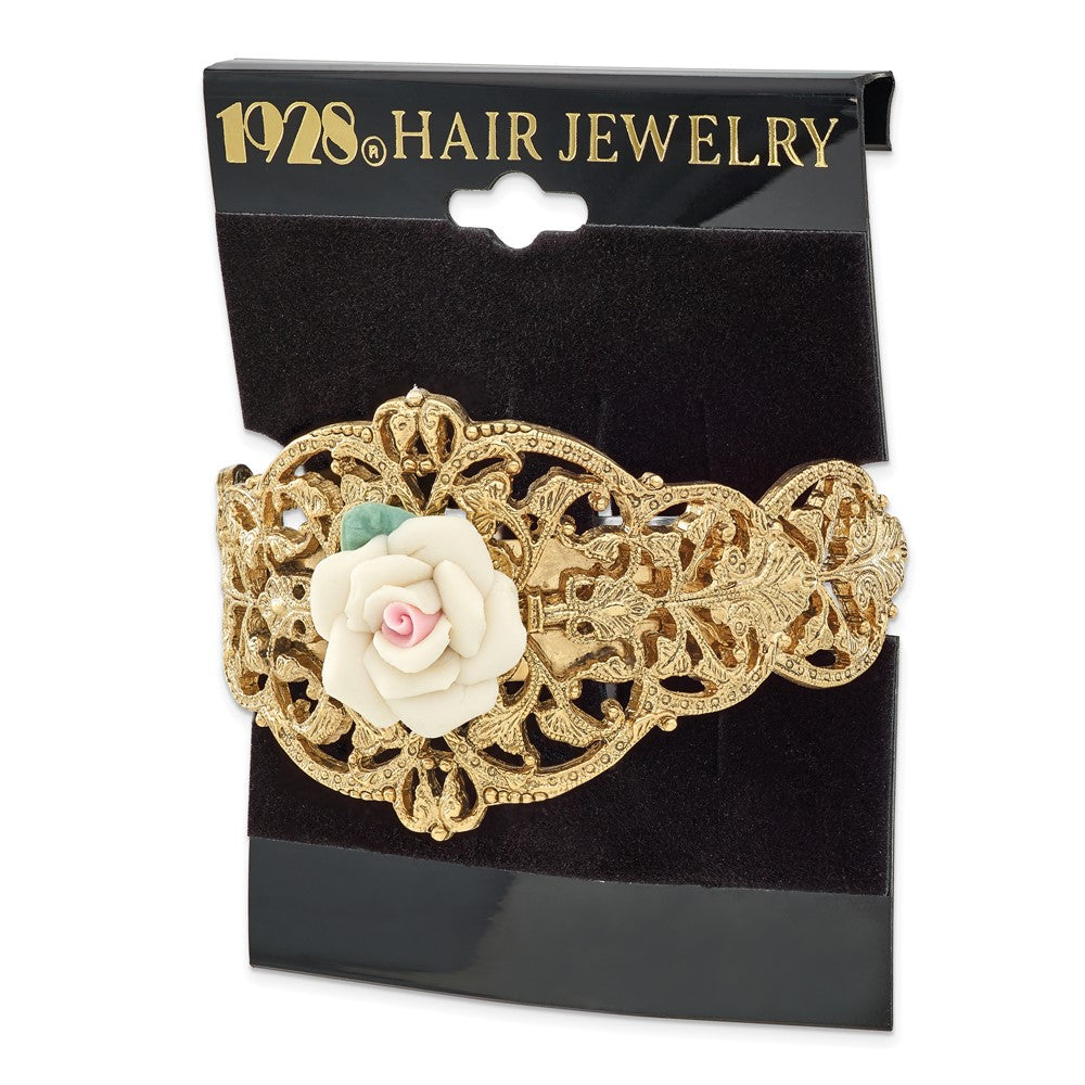 1928 Jewelry Gold-tone Filigree Ornate Porcelain Rose Ponytail Holder