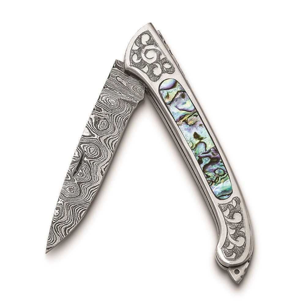 Luxury Giftware Damascus Steel 256 Layer Folding Blade Abalone Inlay Handle Knife with Leather Sheath and Wooden Gift Box